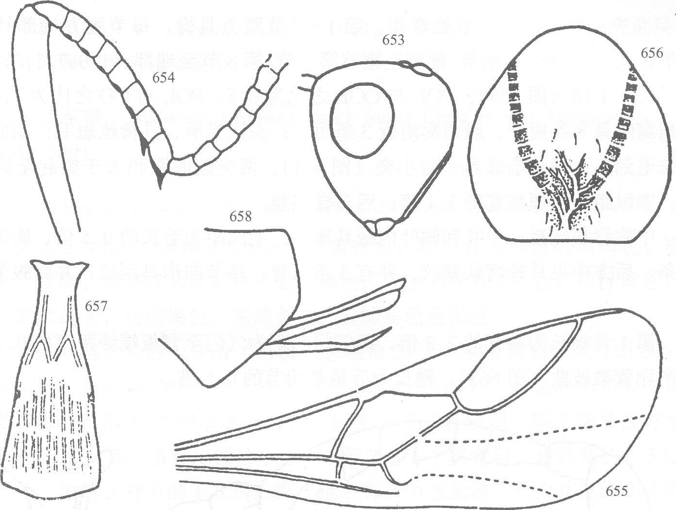 雌 体长约2.7mm,前翅长3.1mm。体黑色。触角基部第l、2节及第3节基部之半褐色,其余各节褐黑色;须黄色;颜面(除两触角之间的下方褐黑色)、唇基、上颚、颊、单眼、后颊、足(除后足跗节黑褐色及端跗节褐黑色)褐色;产卵管鞘褐黑色;翅透明,基脉与翅痣灰黄色...