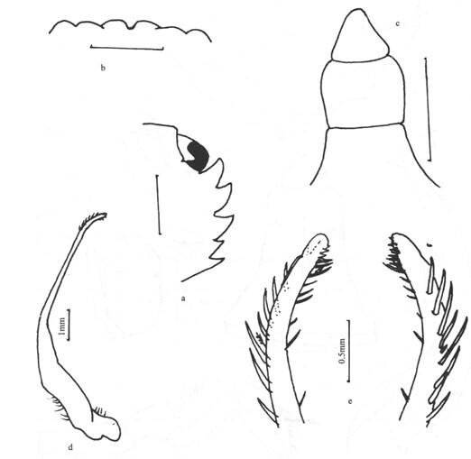 形态描述 头胸甲表面覆有刚毛,额区及前侧缘附近具分散的颗粒群。头胸甲前部具额后