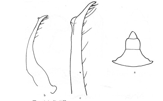 。额分6叶:中央叶与第1侧叶宽,两者宽度相近且部分重叠,第2侧齿很窄,近三...