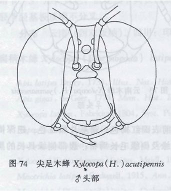雄体长20rnm;黑色;翅褐色透明,闪铜色光泽。头明显窄于胸宽;复眼大(图74);唇基光滑,仅两侧具稀的刻点;中胸背板中央光滑;后