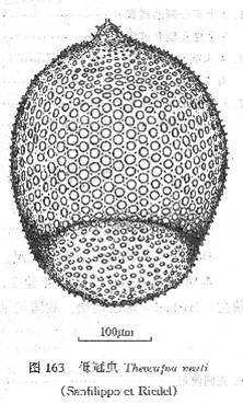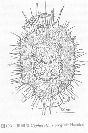 内皮壳具不规的、类圆形的孔。孔直径为孔间桁宽的3-4倍。每室在纵轴(子午线)上有5-6孔,横轴(赤道轴)上有7-8孔。外皮壳薄,具大小相异排列不规则的圆形或类圆形小孔。孔间桁粗细很不一致,但一般比内皮壳的小3-4倍。全外皮壳外生大小不同的棘刺。两极的棘刺稍粗,...