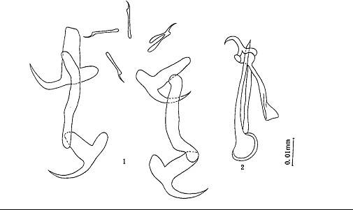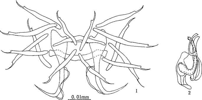体大型,体长1.50—1.65mm,宽0.20-0.21 mm。边缘小钩发育良好,长0.038-0.058mm。中央大钩全长0.031-0.044mm,基部长0.029-0.046mm,钩尖长0.030-0.032mm,内突0.010-0.013...