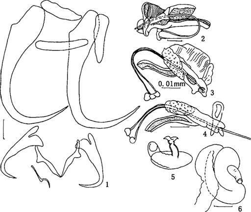 体很小,体长0.239-0.281 mm,体宽0.063-0.l05 mm。边缘小钩发育良好,长0.018-0.030mm,其中第2对最长,第7对最短。中央大钩全长0.027--0.030mm,基部长0.025-----0.026mm,钩尖长0....