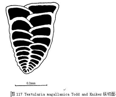坦或微凹,缘角亚锐,房室界限不甚清楚。双列部分横切面略呈长方形,其宽侧面与3列部分的一侧面相