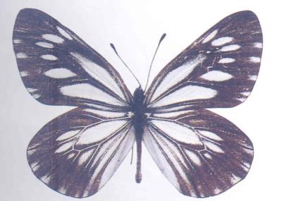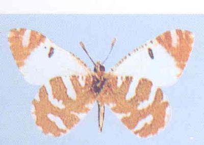 黑色,常愈合成横带,从前缘2/3处到Cu1有1条黑色斜带,和顶角的横带连成“V”字形,围住1个红色