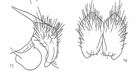 形态 ♂:体长为7.0mm。眼密生棕色长纤毛;额等于前单眼宽;约为触角第三节宽的1/3;下眶鬃伸延至前单眼,上半部的鬃小毛状,无上眶鬃;侧额和侧颜具灰粉被;侧颜等于或稍大于触角第三节宽;触角黑,第三节长为第二节长的2倍强;芒长羽状,最长芒毛为触角第三节宽的2...