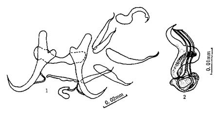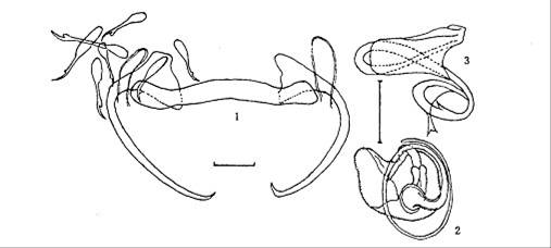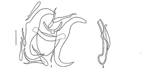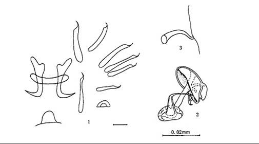 体中等大小,体长0.69—0.72mm,宽0.099—0.107mm.后吸器与体分界明显,大小0.065×0.058mm.咽椭圆形,0.02 1—0.023.0.0 1 6—0.0 1 8mm.边缘小钩粗大,柄和柄轴不易区分,钩长0....