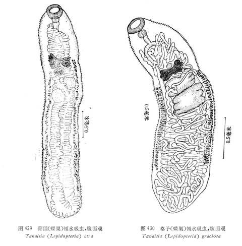 成虫形态(图429) 虫体延长呈舌状,体表除前后两端外均被小棘,两端钝圆。长4.180—4.257,虫体最宽处在睾丸