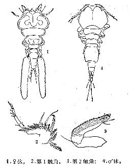 节渐次趋窄。生殖节两侧缘显著突出。卵囊窄长。腹部分3节。尾叉末端具两根长刚毛,外侧缘及内、外末角各具一短刚毛。第1触角基部3节合成...