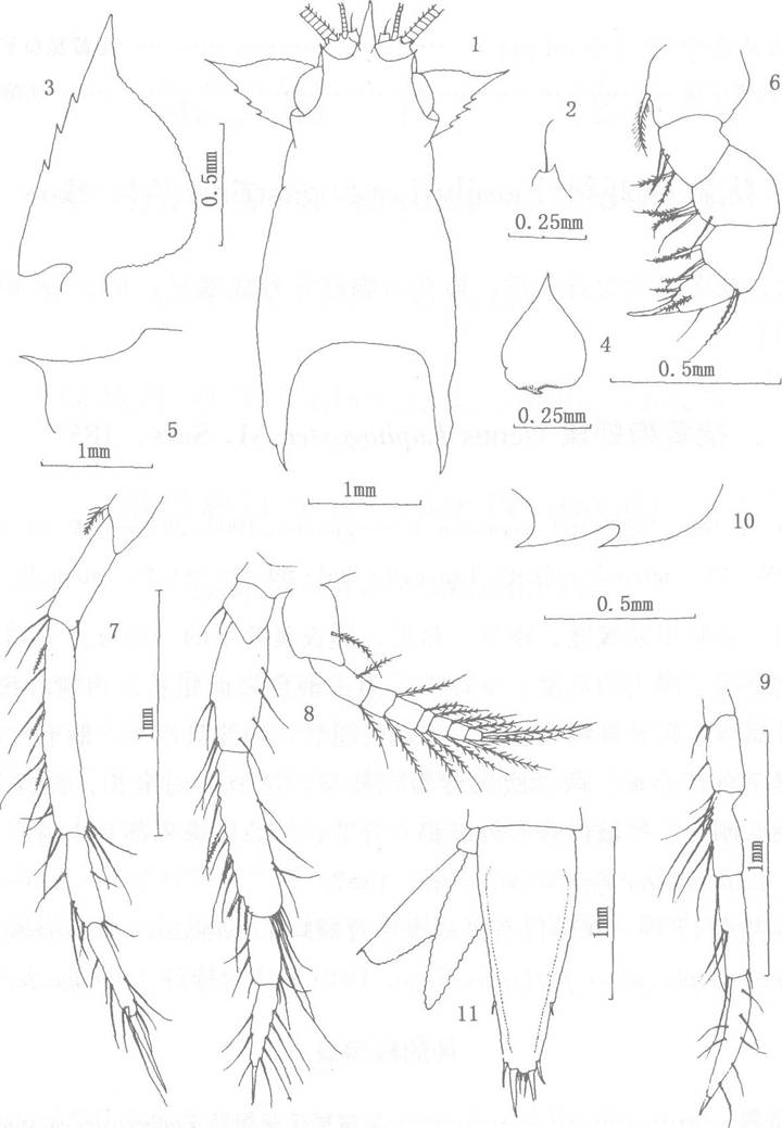额板中央刺尖,呈长刺状,其顶端显著长于第1触角柄,但明显地短于第2触角鳞片;侧缘刺较短而尖,略呈