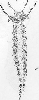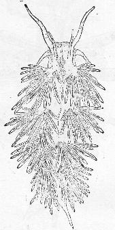 形。体长25-30毫米,宽12-14毫米。口触手特别长。末端尖细,平滑,向后方伸展,占体长的约1/3。嗅角短小,呈棍棒状,平滑。眼位于嗅角基部的外侧。体背侧有鳃突起,呈长纺锤形,排列成斜列,共有11-12对。每鳃列有8-10个。在背中部的较...