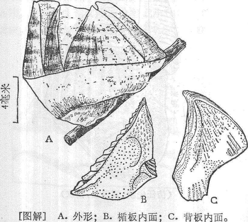椐板和背板钙化在一起,无缝痕。椐板外表生长脊部分狭窄,基缘显著凹进,