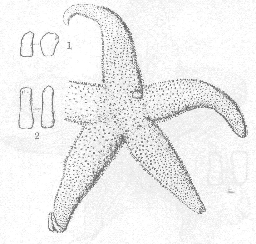 体扁,背面稍隆起,口面很平。腕5个,基部宽,不很压缩,末端渐渐变细,边缘很薄。背板结合成致密的网状,