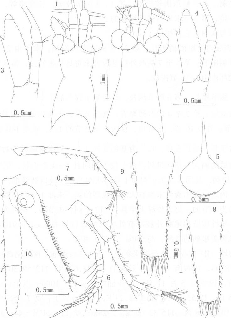 部背面;3雄性第2触角;4.雌性第2触角;5.上唇;6.第3