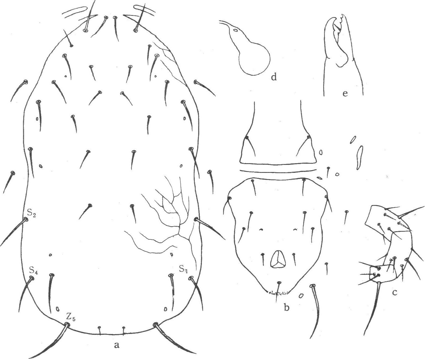 雌螨:背板长380一385μm,宽235—236.5μm。具微弱的网纹。背刚毛17对,孔5对,其中前侧毛6对(j3,z2,z3,z4,s1,s6),后侧毛3对(S2,S4,Z5),Z5毛具微弱的小刺,其余各毛光滑。