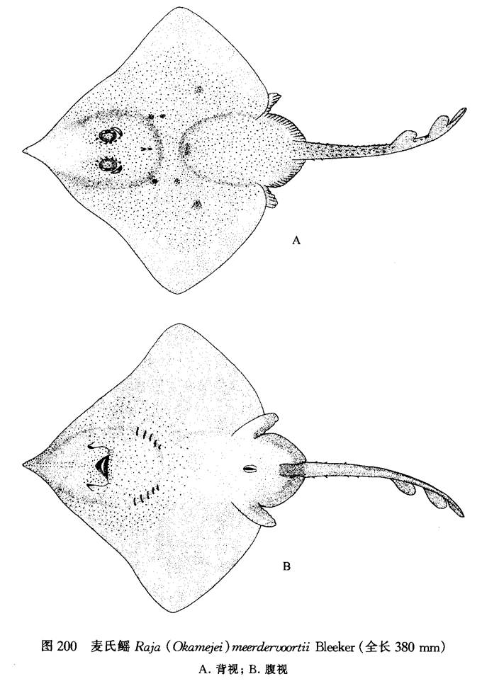 体盘前部斜方形,后部圆形。前缘稍波曲,吻侧处凹入;后缘广圆。