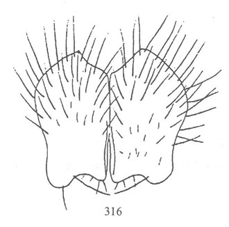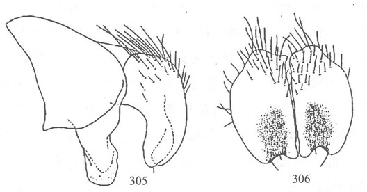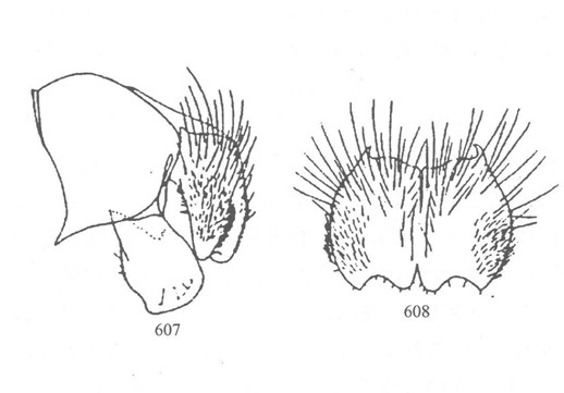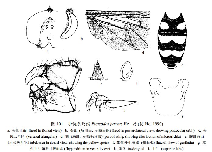 形态 ♂:体长6.5—8.0mm。眼疏生短纤毛;额略狭于前单眼宽;间额在中段消失;额、侧额及颜面暗棕色;下眶鬃达单眼三角,上2/3小毛状,无上眶鬃;侧颜为触角第三节宽的1/2;触角深褐色,第三节长为宽的3倍;芒长羽状,最长芒毛为触角第三节宽;颊暗棕色,具黑毛...