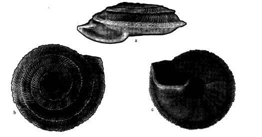 形态特征 贝壳中等大小,左旋,壳质厚,坚实,有光泽,呈凸透镜形。有7~71/2个螺层,前几个螺层十分缓慢增长,略膨胀,螺旋部扁平,呈扁圆锥形。体螺层急骤增长,特膨大,在前方明显下降,底部凸出,在周缘上有一粗的