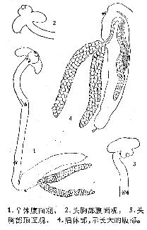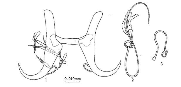 成虫形态 中型蠕虫,体长0.437—0.650mm,体宽0.1 78—0.1 80mm.边缘小钩发育良好,柄、柄轴及钩尖基突均显著,全长0.027—0.034mm.钩尖长0.007 mm.中央大钩强健、粗大,具韧带,全长0.090—0.092mm,基部长0....