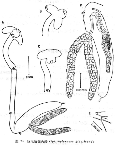 雌鳋(图73A):头胸部缺分枝的头角,仅在口器部分的背面具一椭圆形的磁大球体。