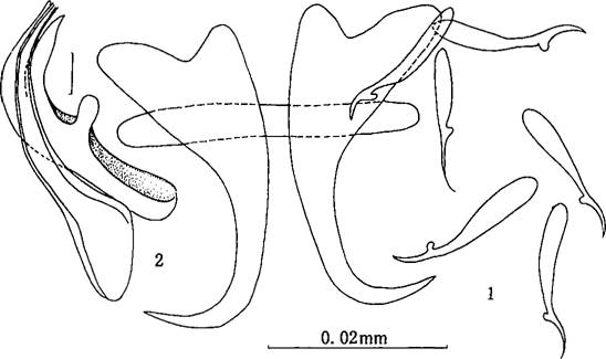 酒精固定标本黄褐色,第1—2刚节具深褐色斑。