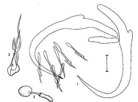 后吸器具二联结片。边缘小钩明显区分出柄,柄轴,及钩尖基突三部分。其长0.01 8-0.027mm,一般以第三对钩最长,第7对钩...