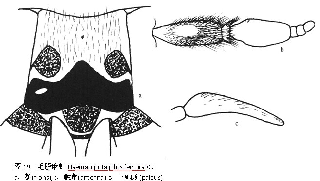 形态 ♂:体长5.5—6.5mm。眼疏生短纤毛,毛长仅为前单眼宽度之半;额宽约为前单眼宽的2倍,略狭于后单眼外缘间距;间额棕至暗棕色,约与前单眼等宽;侧额和侧颜暗棕色,具银白粉被;下眶鬃5—6对,上方3对毛状;侧颜宽为触角第三节宽的1/2—2/3;触角暗褐色...
