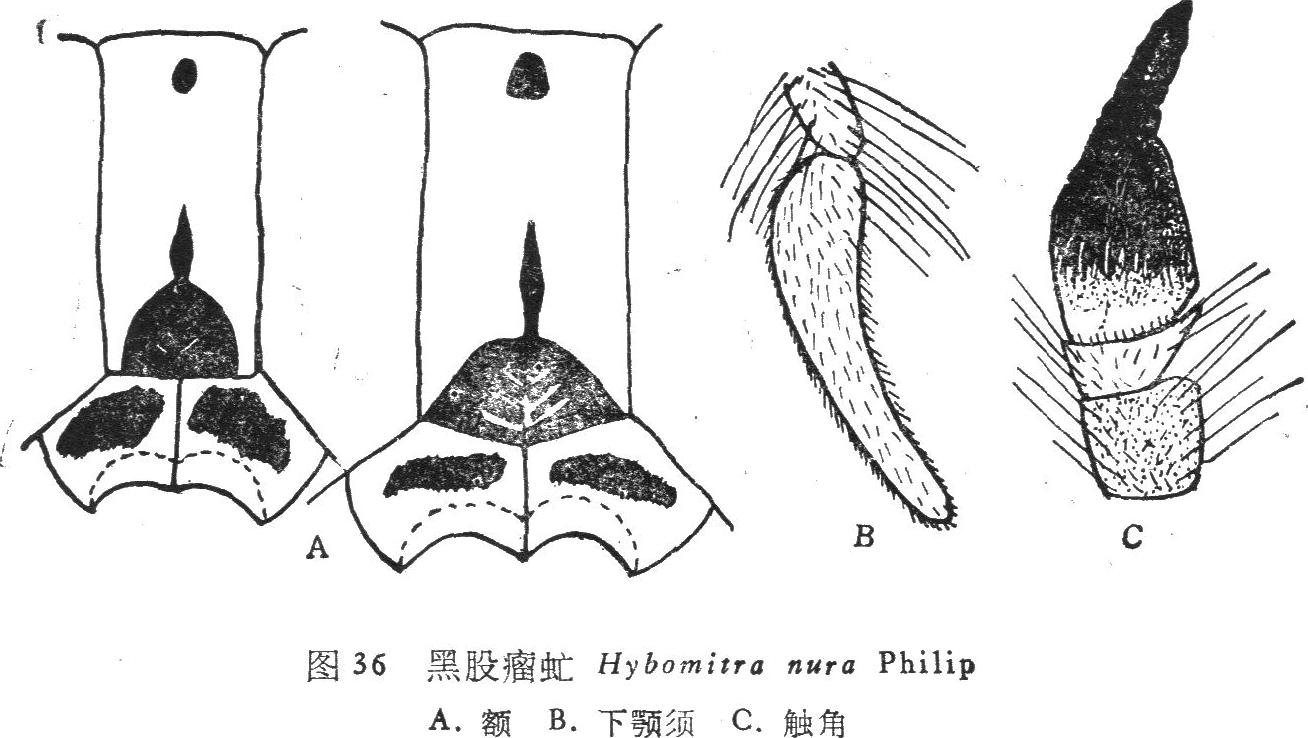 头部 复眼密覆黄色短毛。额覆灰色粉被,具浓密的橙色长毛及少量黑毛,两侧平行,或顶端稍宽于基部,高度约为基部宽度的1.7-2.5倍。基胛黑色,近方形,具皱纹,但基胛形状多变异,两侧与眼稍有距离或相距甚远,或与眼接...