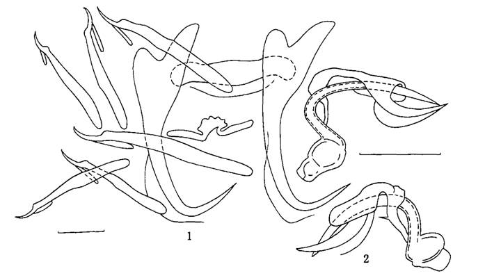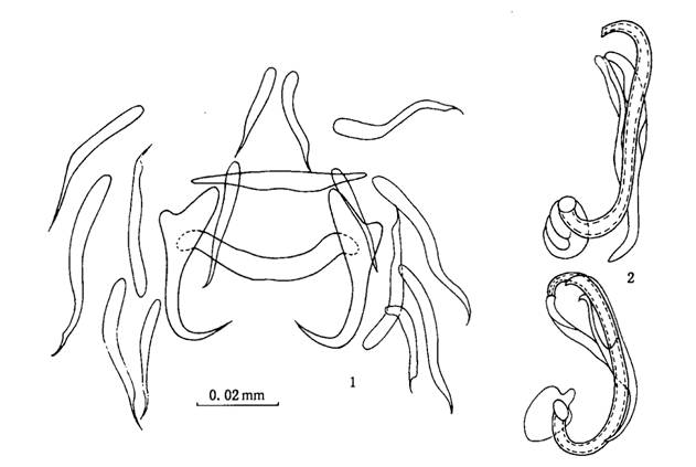 后吸器仅有一联结片。边缘小钩有明显区分的柄,柄轴,及钩尖基突。边缘小钩长0.020-0.026mm,以第3对钩最长,第6对钩最短。中央大钩与P.m...