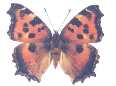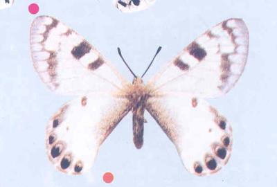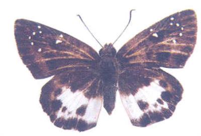 点很小,亚顶端5个排成“S”形,m3室也有1个,中室端及其前面各1个。后翅中部从Rs脉到后缘大片白色,外缘区黑