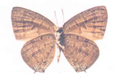 翅红黄褐色,外缘锯齿状。前翅外缘有2条暗褐色带,杂有黄褐色与青蓝色,其内侧有黑色宽带角附近有灰白色的短