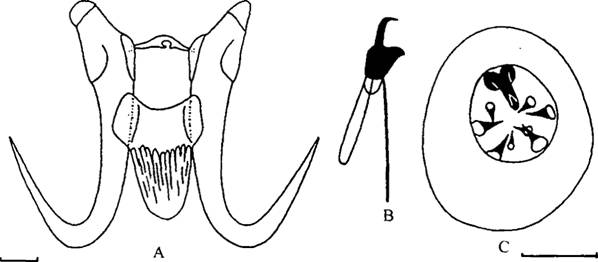 0.357—0.449 nqlTl,宽0.097—0.1 14 mm.后吸器与体前部分界明显.边缘小钩发育良好,