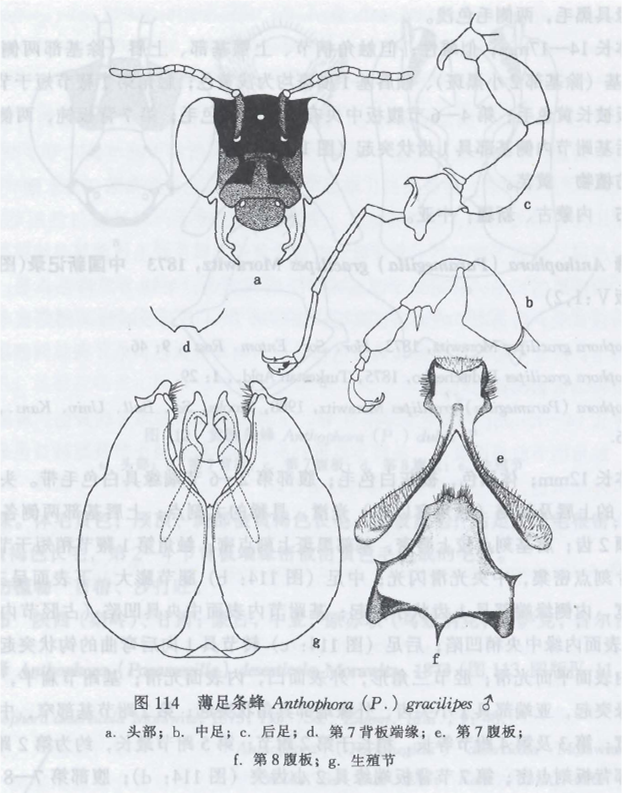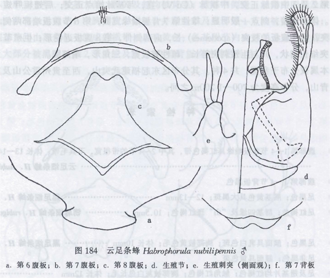 雄体长12mm;体黑色,被灰白色毛;腹部第2-6节端缘具白色毛带。头部(图114: a)的上唇及颜侧(触角窝以下)光滑,具稀的大刻点;上唇基部两侧各具1圆斑;上颚2齿;唇基刻点较上唇密,基部黑斑上刻点密;触角第1鞭节稍短于节2+3;胸部盾片刻点密集,中央光滑闪...
