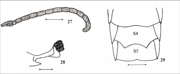 色毛。颚眼距宽;唇基两侧具细密刻点;上唇近方形,具粗刻点及皱;触角第1鞭节等于节2十3十4,第4节宽大于长,第5节长宽相等,稍长于以下各节;胸部背板闪光,具细刻点。体黑色;翅基片浅褐色,翅痣及翅脉浅褐色,翅沥青黑色;