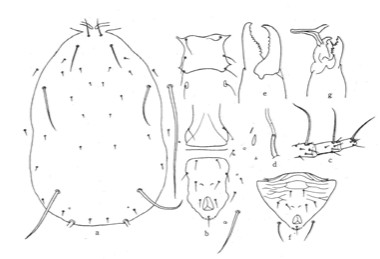 雌螨 背板光滑,背板长361-365μm,宽258-261μm,Z4,Z5具刺,其余各毛光滑,Z5很长,Z4和s4中等长度,j1和j3次之。其余各毛微小。胸板、生殖板、腹肛板正常。受精囊颈圆柱形,近囊部扩大,约15μm,外表呈颗粒状