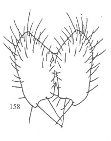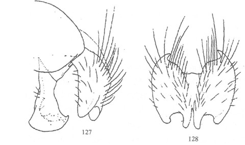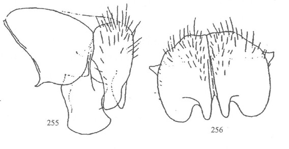 形态 ♂:体长约5.5mm。眼疏生浅色不及中等长的纤毛;额宽稍狭于后单眼外缘间距;下眶鬃下方4对较长大,向上去呈小毛状,有1对毛状的后倾鬃;触角黑,第三节长为宽的2.5倍;芒长羽状,最长芒毛超过触角第三节宽;侧颜狭,为触角第三节宽的1/2;颊高约为眼高的1/...