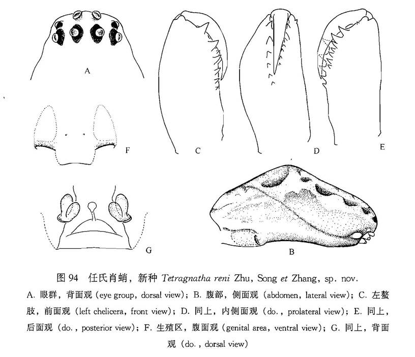 浅黄褐色。两眼列均后凹,前眼列占满头部的宽度,并略较后眼列窄。中眼域长宽近乎相等。前中眼>后中眼>后侧眼>前侧眼。螯肢较细长,但比头...