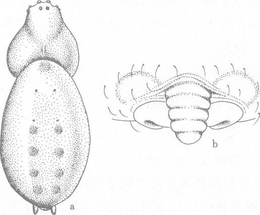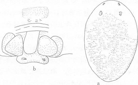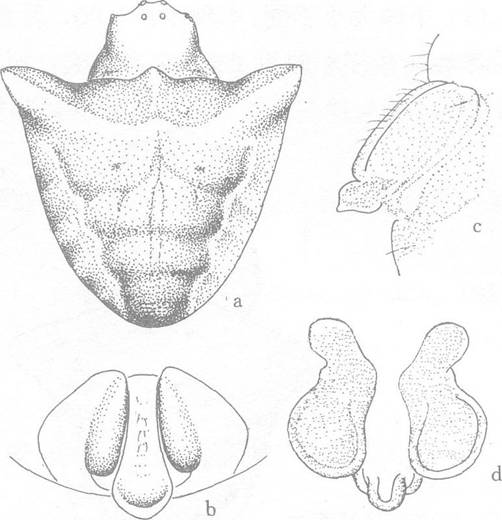于宽,浅黄色,颈沟明显,头区隆起呈弹丸状。中窝纵向,浅褐色。螯肢黄褐色,前