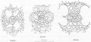 背面观:皮壳有棘,无放射针,孔类圆形,有双边缘。横腰带窄,峡部具两孔。矢隔长于髓壳,8个门孔类圆形。