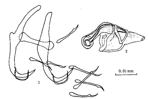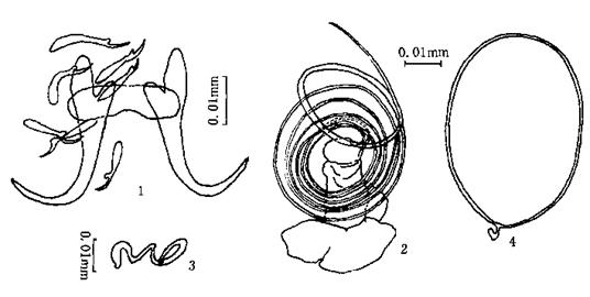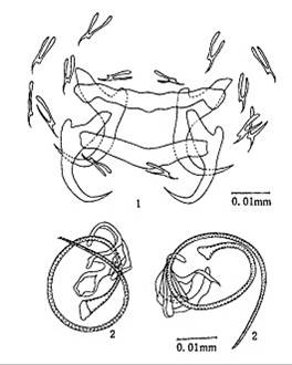 体,体长0.274mm,宽0.149mm。咽直径0.018mm。后吸器边缘小钩长0.018-0.019mm,各小钩发育良好,几等长。中央大钩全长0.033mm,基部长0.024mm,钩尖长0.010-0.011mm,内突O.011mm,外突0...