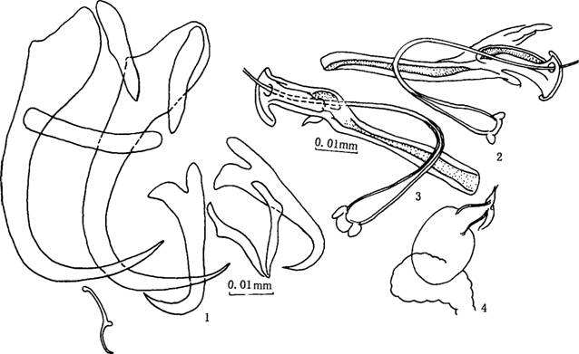 边缘小钩雏型,长0.010—0.01 3 mm.两对中央大钩形式和大小相似,腹中央大钩全长...