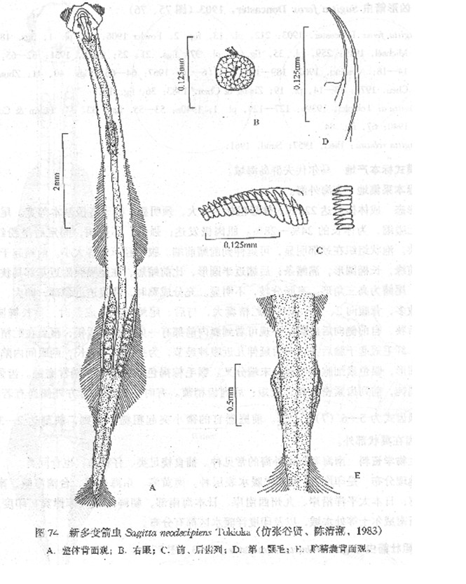 相似,体细长,头中等大小,颈明显,躯干宽度在前、后侧鳍间最大。尾节为体长的28%—29%,在尾隔膜处无缢缩。肌肉层薄,较软,半透明。无泡状组织。颚毛通常每侧6个,前齿很短,三角