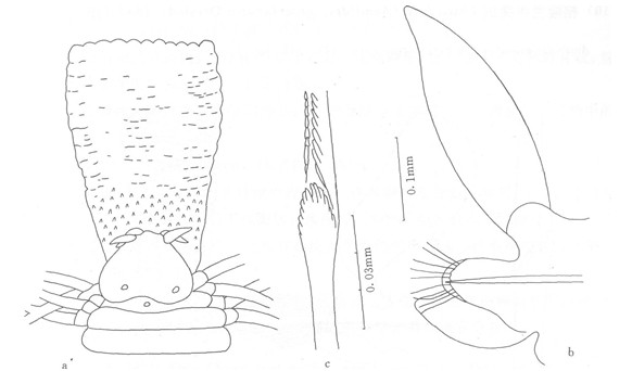 体细长,口前叶心脏形,后面具一脑后突起。吻基部具许多分散排列的小乳突;吻端部具多皱的隆起。全部触须都为锥形,后伸可达第11—12体节。背须为椭圆或尖矛形,长约为宽的3倍。腹须宽而钝。