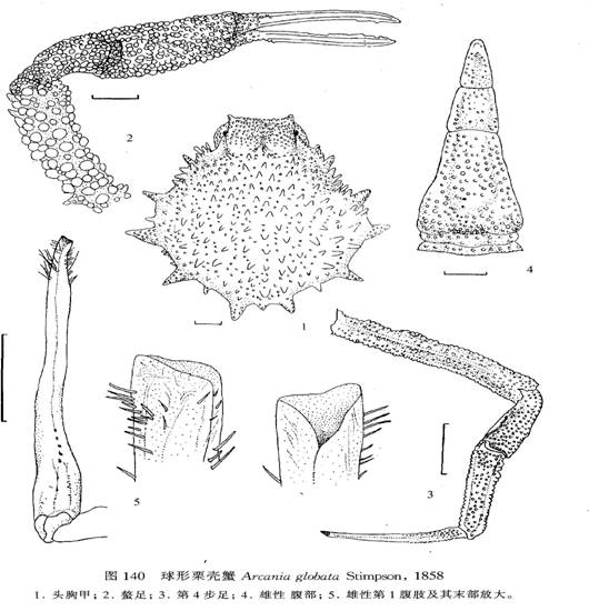 胸甲呈球形,长稍大于宽,背面有几乎等长的锐刺及颗粒。额突出,分成两齿,