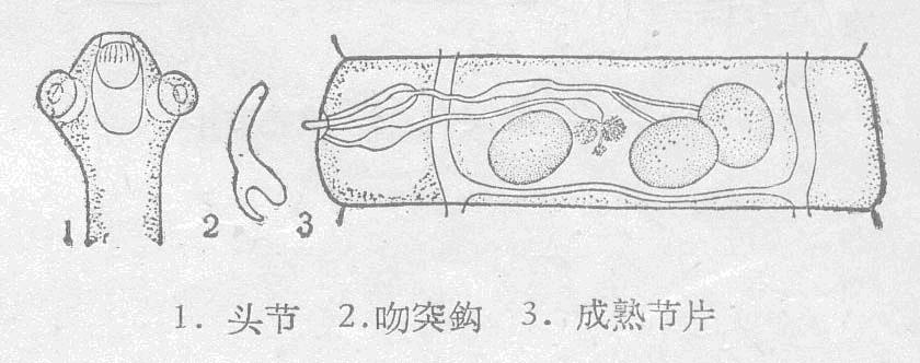 本虫是一种小型绦虫,全长约10-45毫米,多数是20-40毫米,最大宽度为1毫米,约有100-800个节片。全部节片宽度大干长度。生殖孔位于节片的单侧。