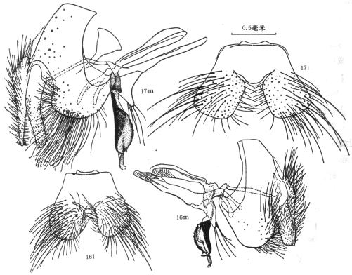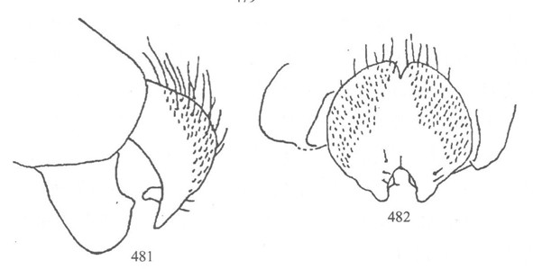 雄性 头顶三角区黑色,毛黄褐色;额淡褐色,覆淡色粉被,无毛;颜淡褐色,覆薄粉,无毛,颜面深凹,下半部突出略低于额突;颊褐色。触角淡褐色,第3节卵圆形,长略过于宽,芒基部1/3淡褐色,端部2/3褐色。中胸背板黑色,被黄褐色直立的短毛;在横线前具不明显的短毛纵条...