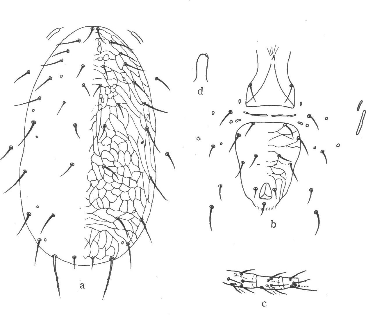 雌螨:背板长290—295μm,宽155μm,长椭圆形,密布网纹,背刚毛18对,近z3、z4、s4、S4和S5毛处具显著的孔各1对,Z5较长,具微刺,其余各毛长度在15—32μm之间。