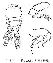 节极小,生殖节膨大如坛状,宽大于长;腹部3节,第三节后缘中央微向前凹;尾叉细长,其长约为宽的3至3.5倍,末端具4根长短不一的刚毛。<...