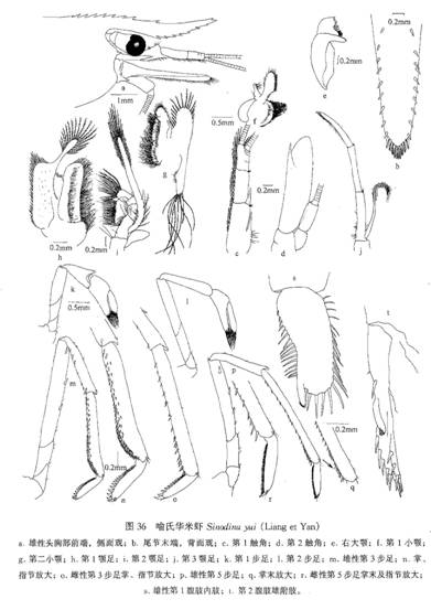 额角(图36a)通常雌性较雄性显著的上翘,超出第1触角柄或鳞片的末端;上缘基半部具5—13齿,其中基部有2—7(通常为4)齿位于眼眶后方的头胸甲上,在额角尖端具1—2(通常为1)个附