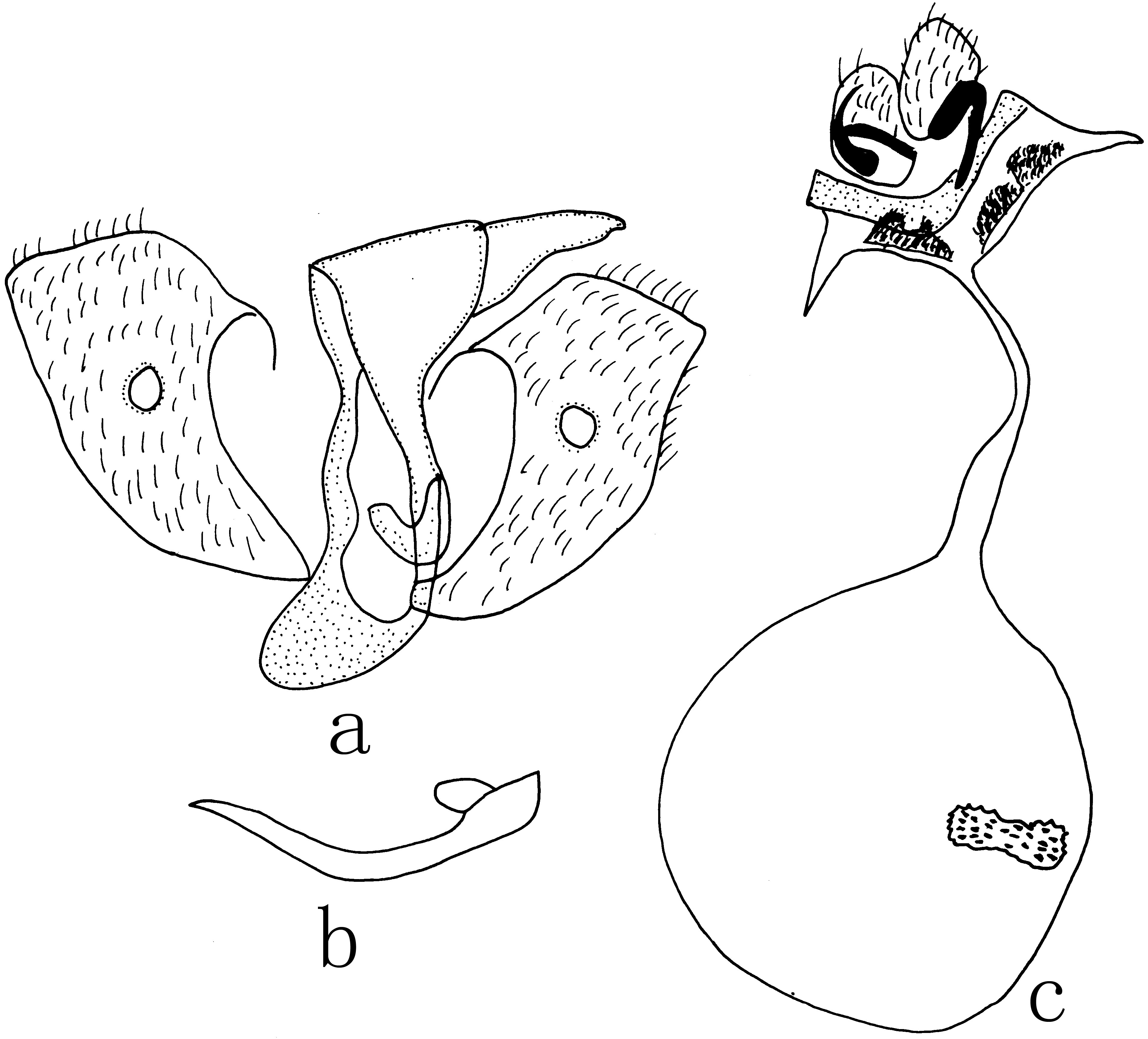 雄性 体黑色,具光泽。头顶和额被黑色长毛;颜两侧直,下部不很明显